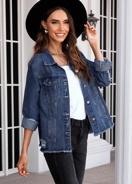 Button Blue Front Flap Pocket Drop Shoulder Denim Jacket
