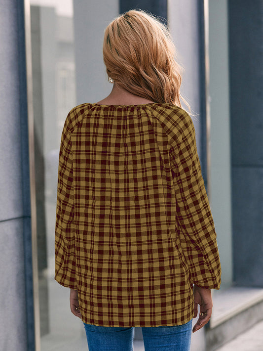 Casual Loose Fit Long-Sleeve Check V-Neck Tie Front Shirt Top