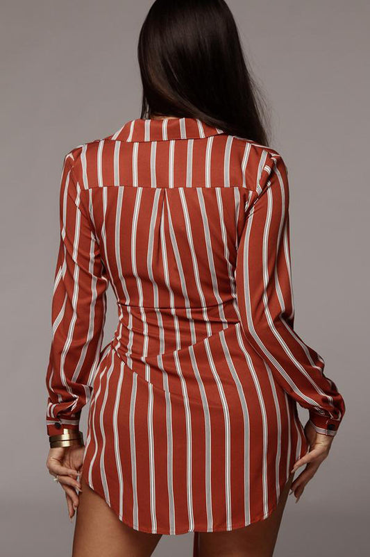 Striped V-Neck Lace-Up Dress Long Sleeve Slit