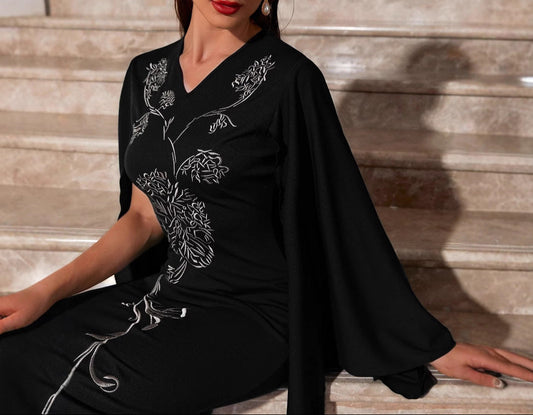 Embroidered Sheath Dress Bat Sleeve Elegant