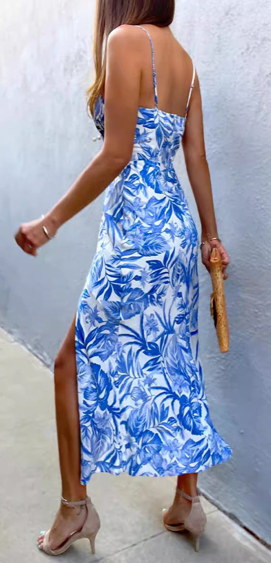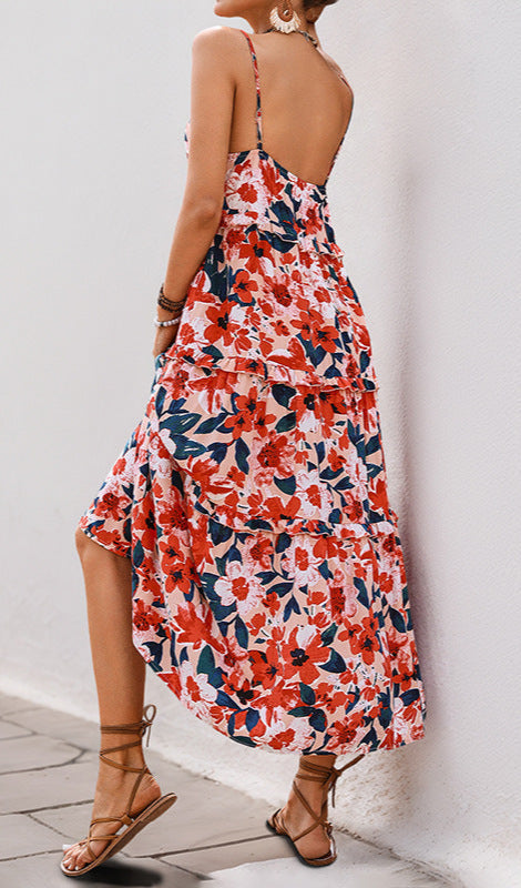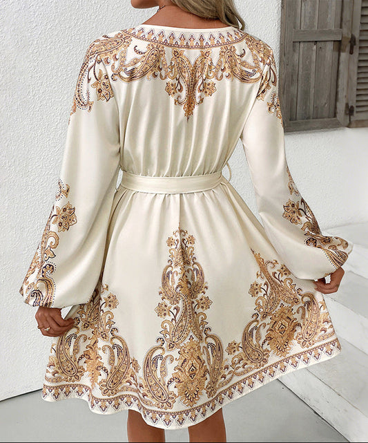 V-Neck Printed Lace Mini Dress Ruffled High Waist Slim Bandage