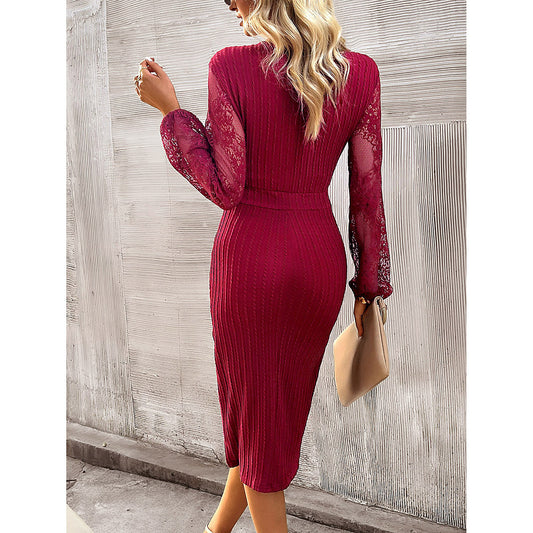 V-Neck Lace & Knitted Long-Sleeve Dress