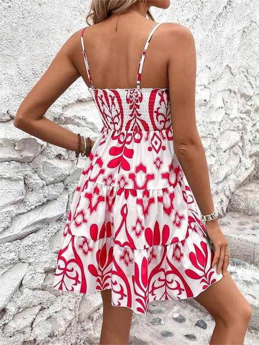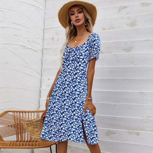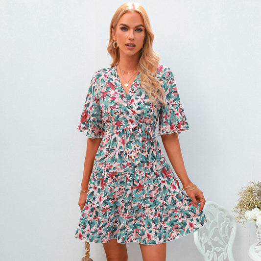 European And American V-neck Short-sleeved Ruffled Floral Dress