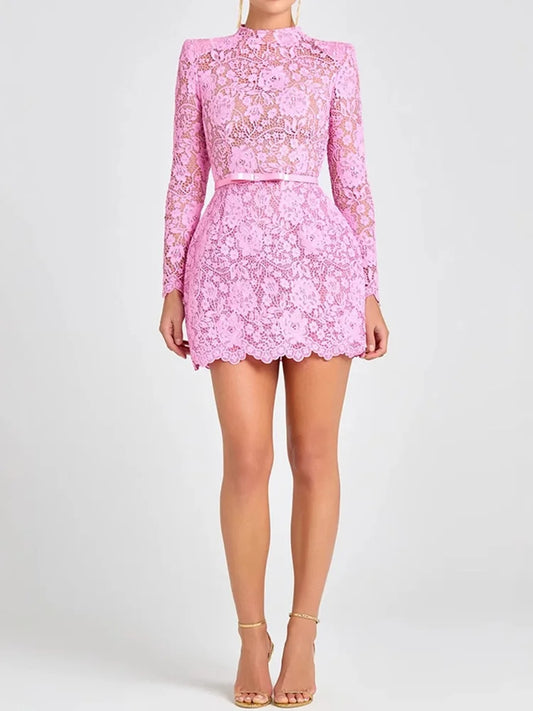 Elegant Lace Mini Dress Sleeve Hollow Out A-line V-neck Short Dresses Casual