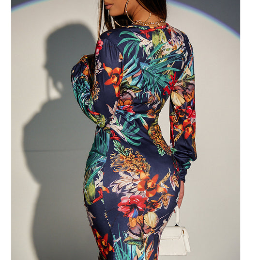 Elegant Slim-fit Spaghetti-strap Floral Print Split Dress