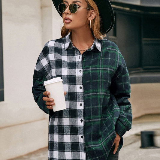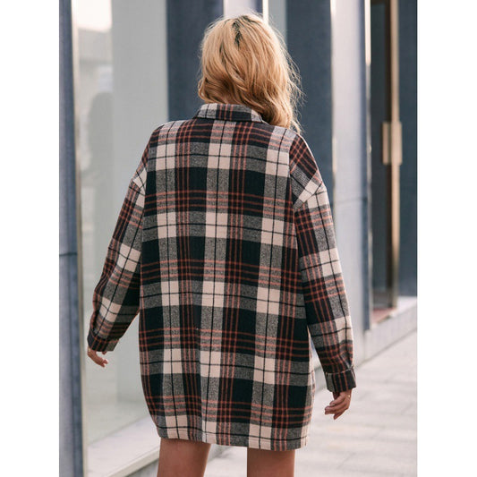 Plaid Single-Breasted Trench Coat Mid-Length Shirt Jacket