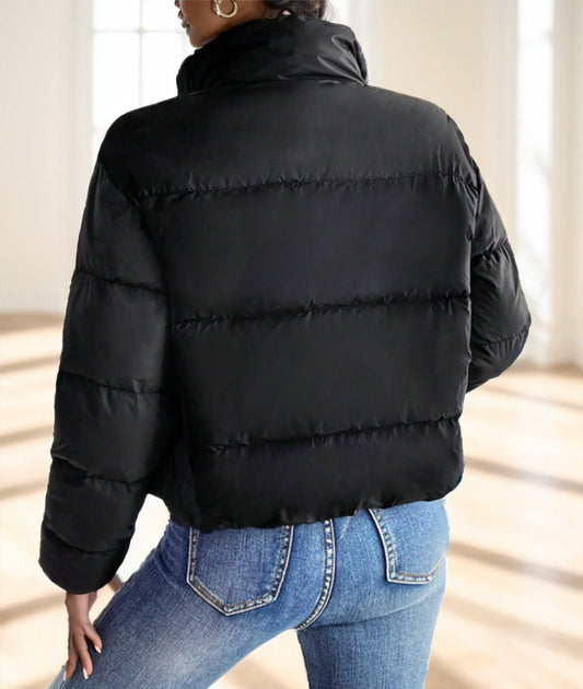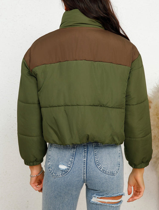 Solid Cotton-Padded Jacket Round Neck Long Sleeve with Zipper & Pockets