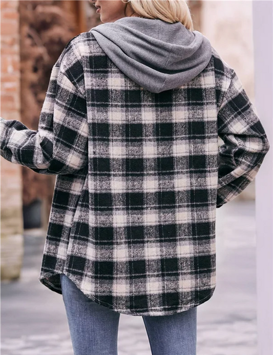Flannel Plaid Hoodie Jacket Long Sleeve Button with Pocket & Drawstring