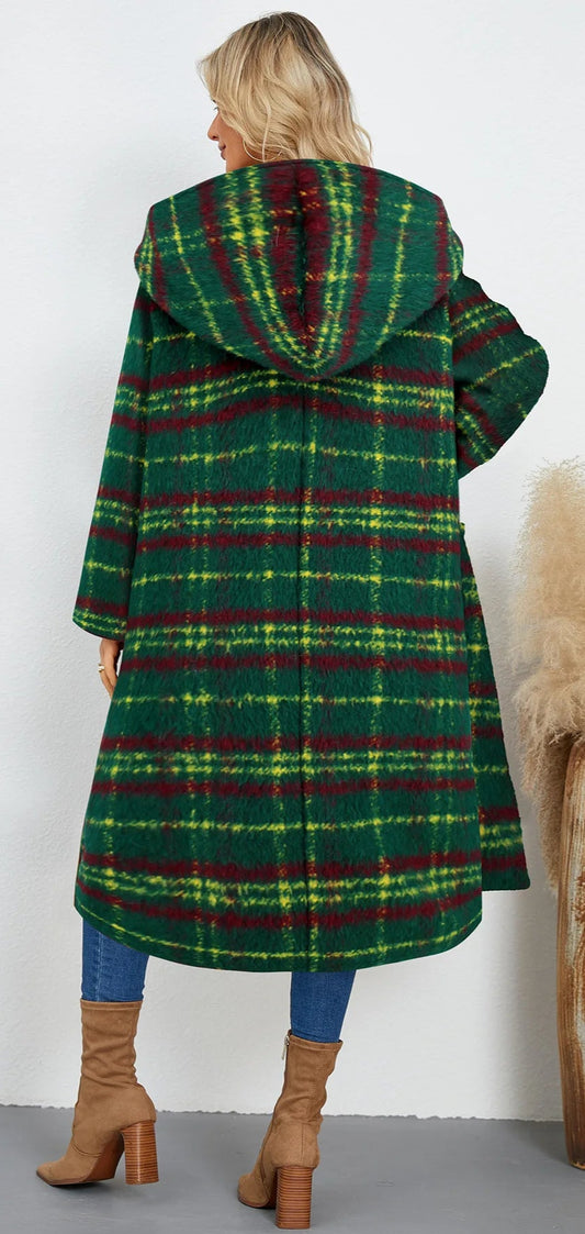 Winter Woolen Coat Plaid Long Coat with Hood