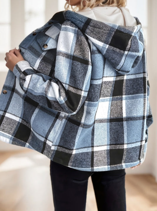 Plaid Hooded Jacket - Casual Long Sleeve Shacket With Button Front