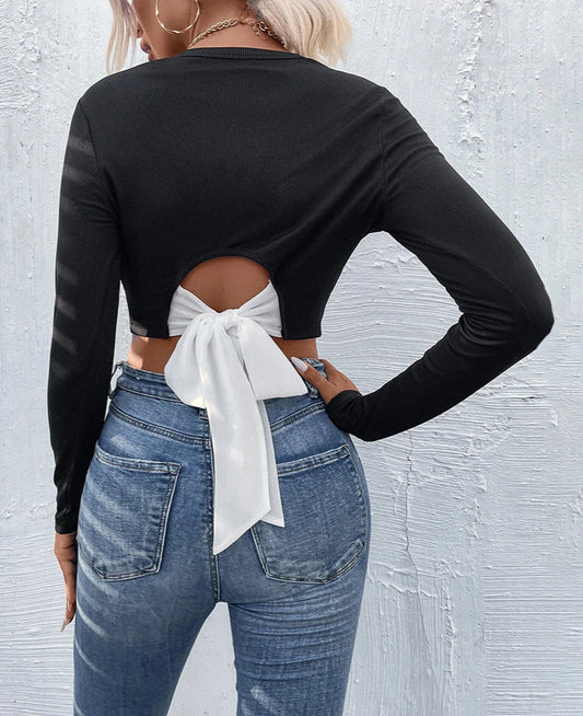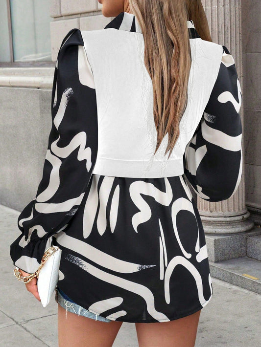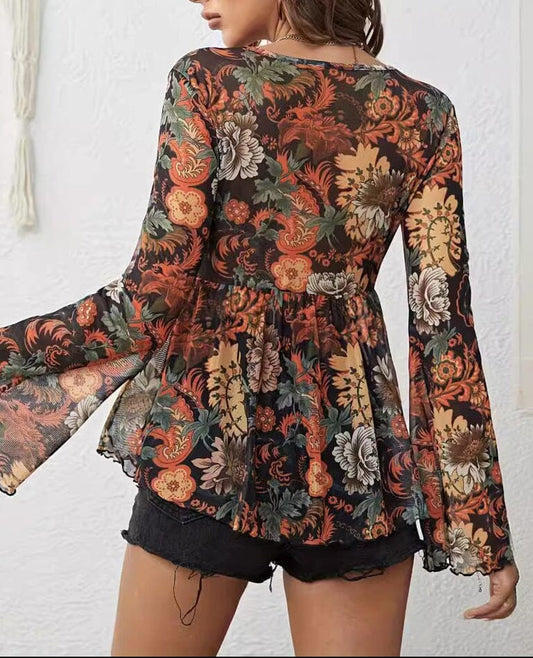 Mesh Printed Front Knotted Flare Sleeve Long-Sleeve Top
