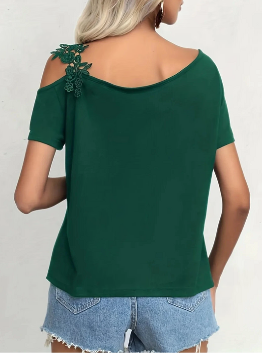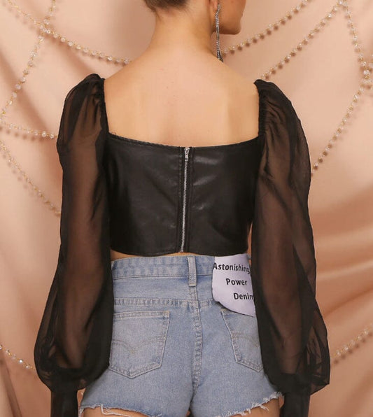 One-Shoulder Mesh Top Puff Sleeve Stitching