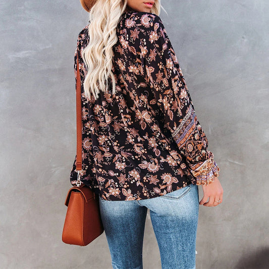Printed V-Neck Lantern Sleeve Shirt Loose Long Sleeve Blouse