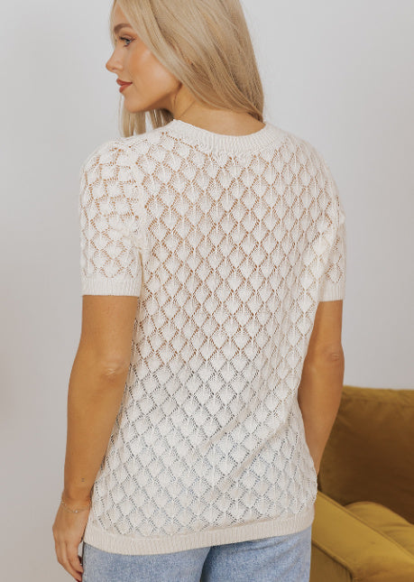 Beige Hollow-Out Crochet O-Neck Short Sleeve Sweater Tee