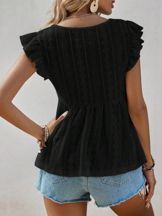 Hollowed-Out V-Neck Lace Top Ruffled Short Sleeve
