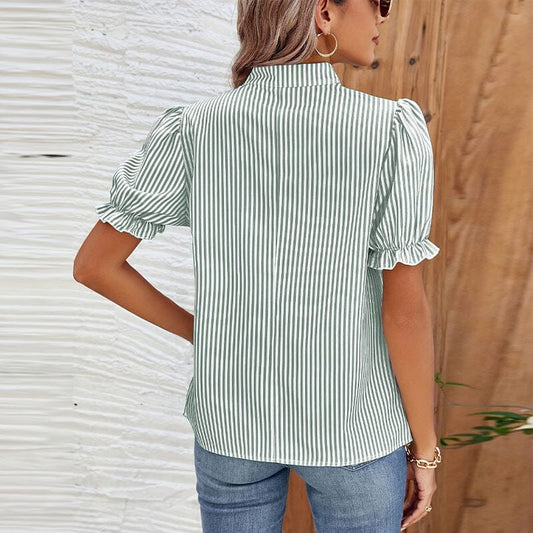 Striped Shirt Lantern Short Sleeve Pullover Top