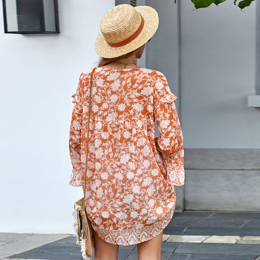 Short Sleeve Floral Summer Loose V-Neck Ruffle Blouse