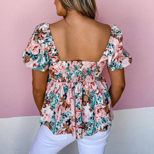 Floral V-neck Short-sleeved Large Swing Ladies Top