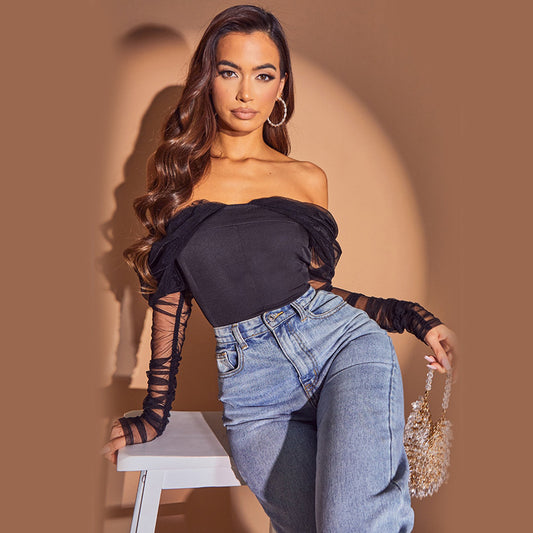 V-Neck Fashion Mesh Panel Puff Sleeve Slim Bodysuit