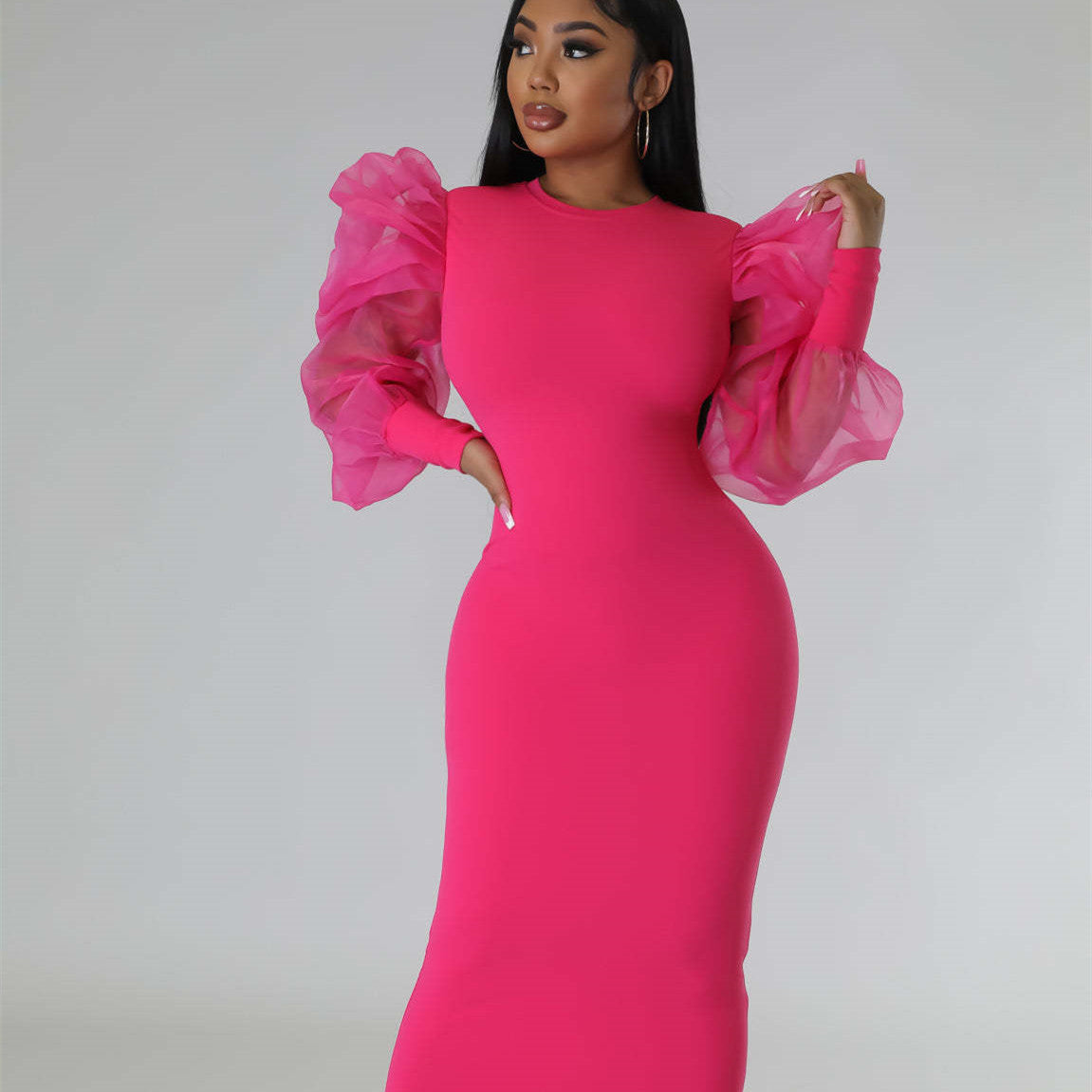Mesh Puff Sleeve Elegant Slim Fit Dress