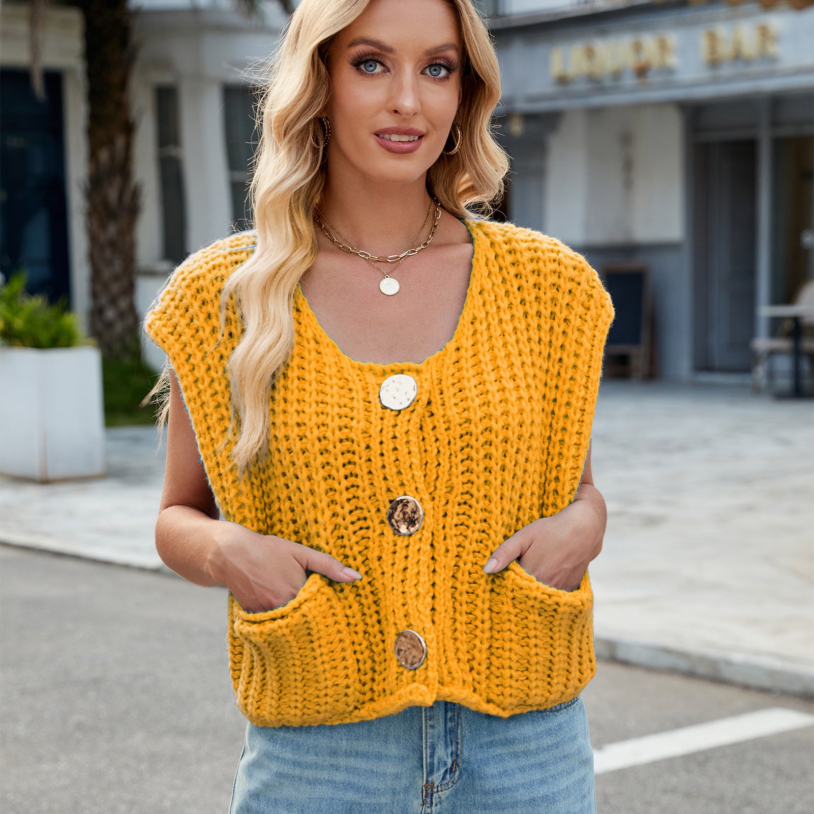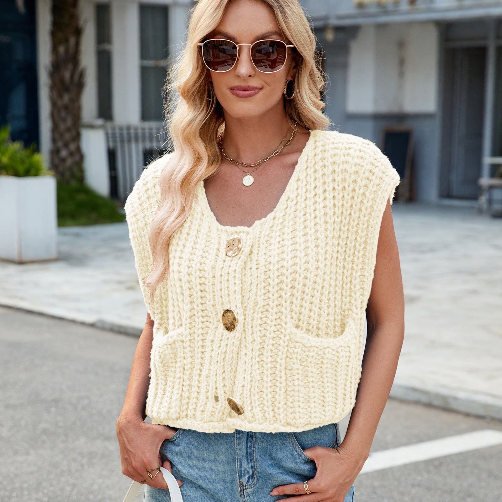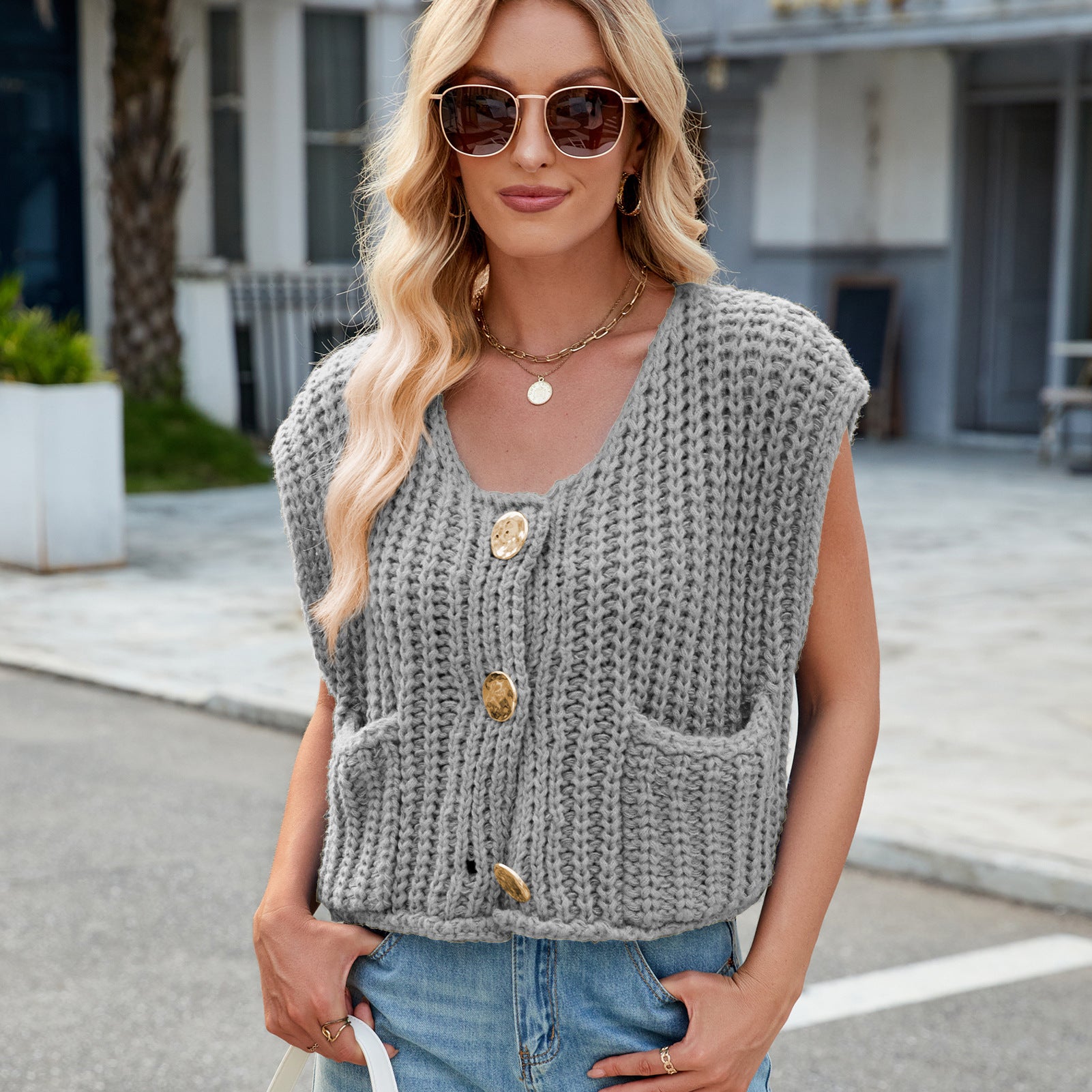 V-neck Three-button Sleeveless Cardigan